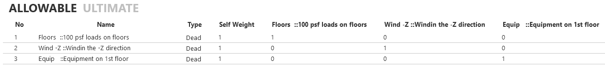 For eg if the load case names in a GT Strudl created structure are as displayed above, and if "Import Load Combinations" option is selected during the import, the Load Combinations page in Mat3D would display both Allowable and Ultimate load combinations as follows: