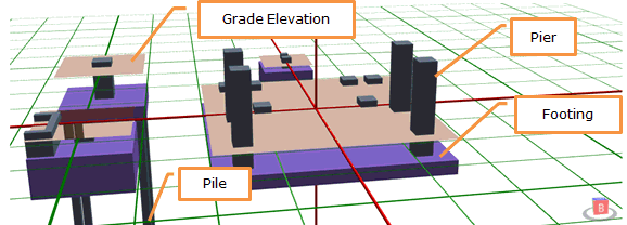 This view will allow users to have a close to real depiction of the actual foundation construct. Each foundation unit including the Footings, Piers, Piles, Grade Elevation is represented as an integrated unit.