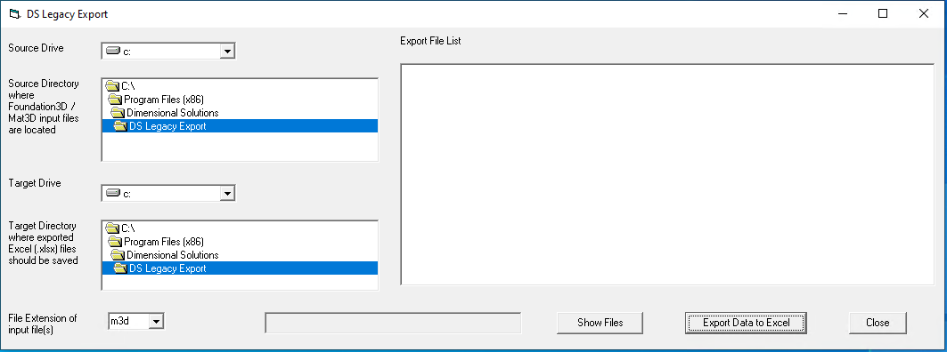 Double-click on "InstallLegacyExportTool.exe" to launch the installation of the utility. After a successful installation, a folder called "DS Legacy Export" is created under "C:\Program Files (x86)\Dimensional Solutions". This folder contains a file called "ExportData.exe", which is the application used to export the legacy Foundation3D, Mat3D and Shaft3D binary files to Excel format.
